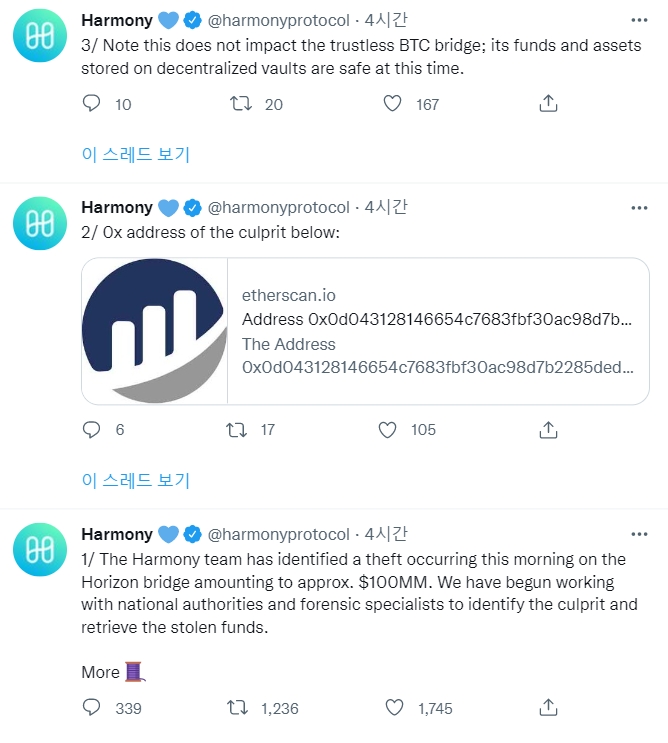 호라이즌 브리지는 하모니와 이더리움 네트워크, 바이낸스 체인 및 비트코인 간의 토큰 전송을 용이하게 한다. 이 브리지의 운영자인 하모니는 23일 늦은 밤 이 브리지가 중단되었다고 발표했다. 다만, BTC 브리지와 그 자산은 이번 공격의 영향을 받지 않았다고 말했다.
