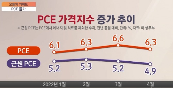 앞서 미국 상무부는 4월 개인소비지출(PCE) 가격지수가 전년 동월보다 6.3%, 전월보다 0.2% 각각 상승했다고 발표했다. 40년 만의 최대폭이었던 3월 상승률인 전년대비 6.6%에서 0.3% 포인트 떨어졌다. 전년 동월 대비 기준으로 PCE 가격지수 오름폭이 둔화한 것은 2020년 11월 이후 처음이다. 전월 대비 상승률은 3월 0.9%에서 0.2%로 대폭 줄어들었다. 변동성이 높은 에너지와 식료품을 제외한 근원 PCE 가격지수는 전년 동월보다 4.9%, 전월보다 0.3% 각각 오른 것으로 집계됐다.
