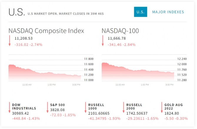 뉴욕증시에서는 금리인상과 침체 관측을 놓고 해석이 엇갈렸다. 연준의 실세인 존 윌리엄스 뉴욕 연방준비은행 총재는 인터뷰에서 "경기침체는 내 '베이스 케이스' 즉 가장 일어날 가능성이 높다고 생각되는 가정을 사용한 모델에서 예상되는 결과가 아니다"고 잘라 말했다. 윌리엄스 총재는 "오히려 경제는 강력하고, 금융 여건은 더욱 엄격해졌다"고 덧붙였다. 그는 올 미 국내총생산(GDP) 증가율이 1∼1.5%에 그칠 것으로 예측했다. 올 성장이 꽤 많이 느려질 것으로 예상하지만, 이것은 경기침체가 아니다. 물가상승 압력을 줄이기 위해 꼭 필요한 경기둔화일 뿐"이라고 강조했다. 제롬 파월 연준 의장의 최측근으로 꼽히기도하는 윌리엄스 총재는 7월 연방공개시장위원회(FOMC) 정례회의에서 0.5∼0.75%포인트의 금리인상을 논의할 것으로 생각한다며 올해 연말 기준금리가 3∼3.5% 수준에 이를 수 있다고 내다봤다. 그는 이어 내년 말 기준금리가 3.5∼4.0%에 이를 것이라는 시장의 관측에 대해선 "지금으로서는 완벽하게 합리적인 예측"이라며 동의했다.