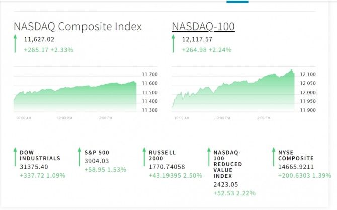 이미지 확대보기뉴욕증시는 다음날 예정된 고용보고서 발표를 앞두고 상승했다. 뉴욕 증권거래소(NYSE)에서 다우존스30산업평균지수와 스탠더드앤드푸어스(S&P)500지수 그리고 기술주 중심의 나스닥 지수 모두 크게 오르고 있다.