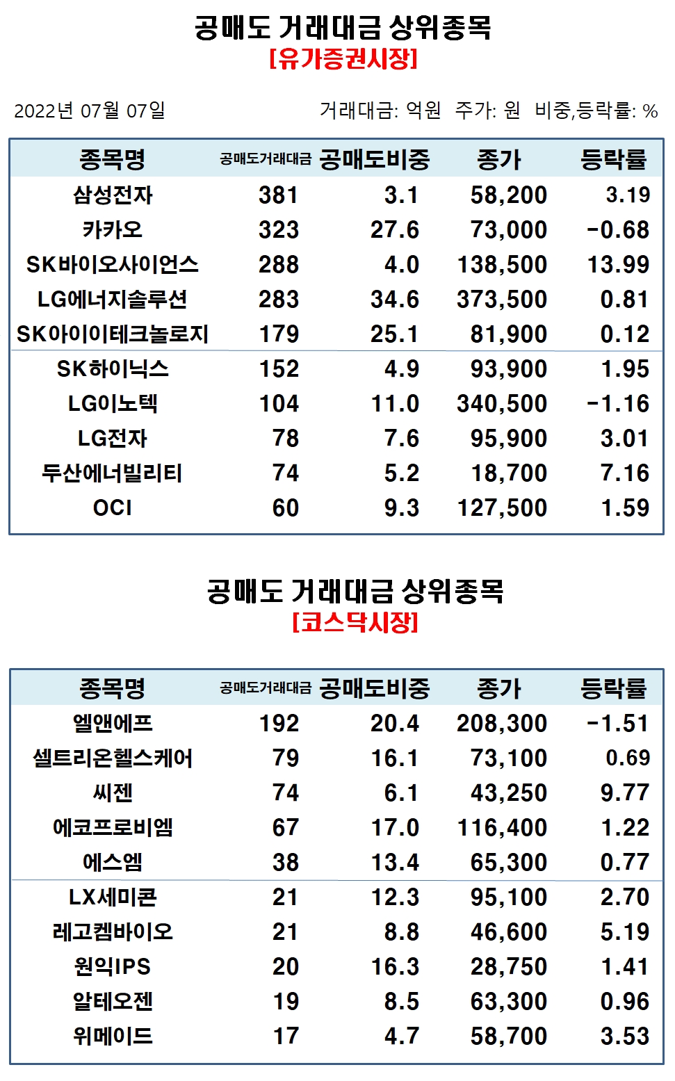 이미지 확대보기유가증권시장에서 공매도 거래대금 상위종목은 삼성전자 381억원, 카카오 323억원, SK바이오사이언스 288억원, LG에너지솔루션 283억원, SK아이이테크놀로지 179억원, SK하이닉스 152억원, LG이노텍 104억원, LG전자 78억원, 두산에너빌리티 74억원, OCI 60억원 순으로 집계됐다.
