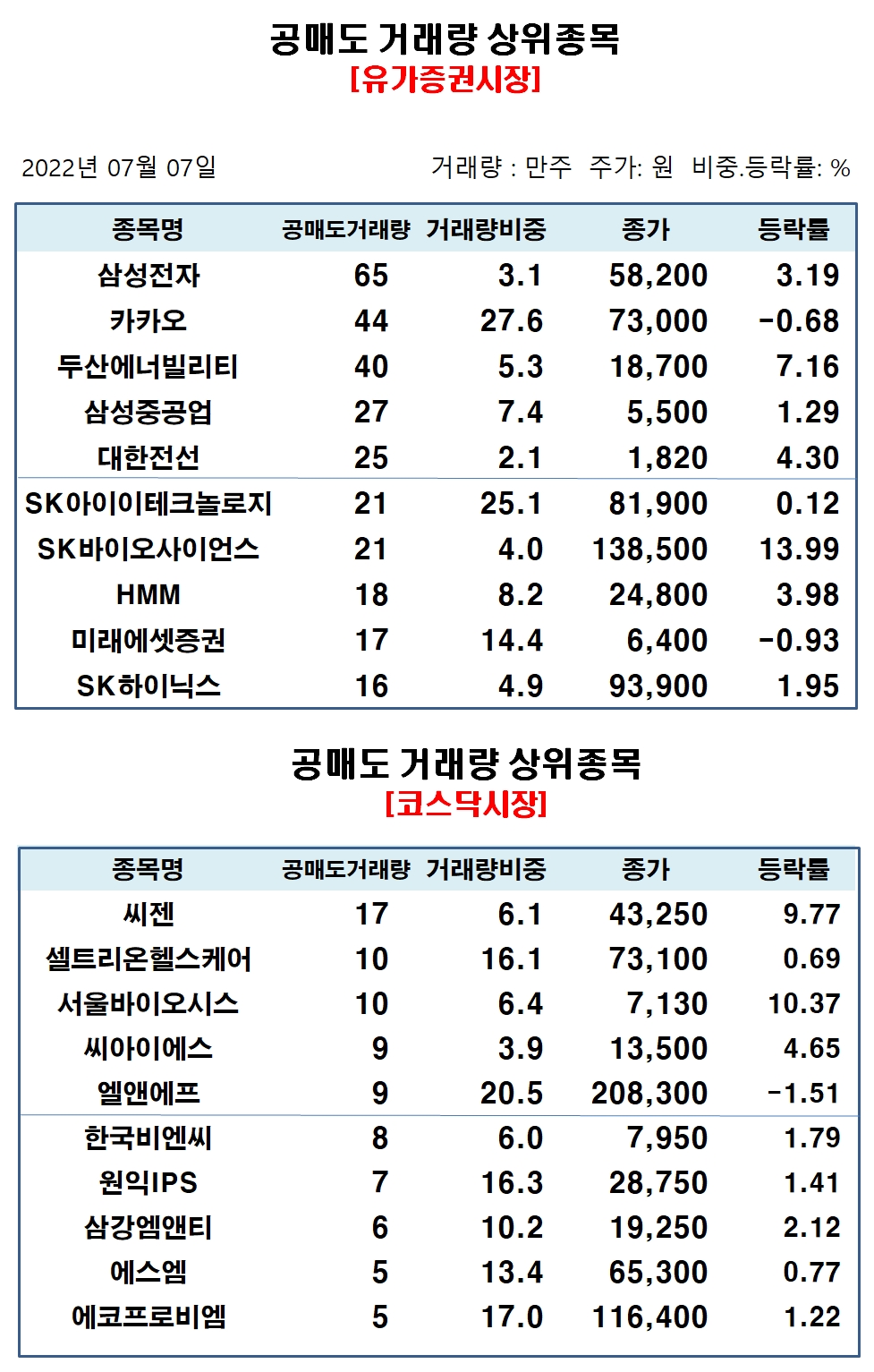 코스닥시장에서 공매도 거래비중 상위종목은 동국제약 21.85%, 유진테크 21.61%, 엘앤에프 20.42%, 원익홀딩스 20.39%, 코리아센터 17.47%, 케이엠더블유 17.43%, 에코프로비엠 16.99%, 코웰패션 16.41%, 원익IPS 16.32%, 셀트리온헬스케어 16.14% 순으로 집계됐다.