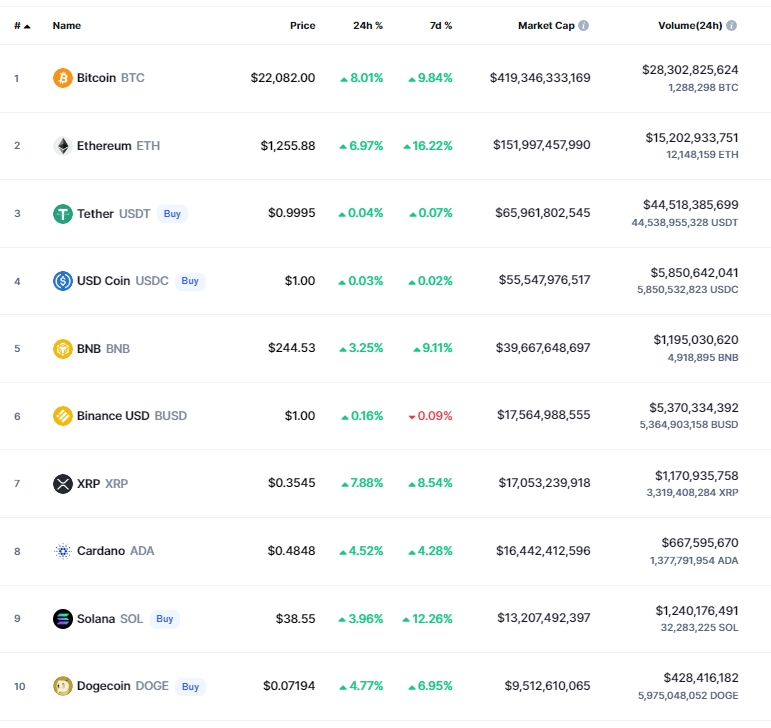 이후 비트코인은 더욱 상승해 8일(뉴욕시간) 오전 1시 48분 현재 8% 상승해 2만2082달러를 기록했다. 이더리움도 6.79% 오른 1255달러였다. 나머지 알트코인인 리플(XRP)은 7.88% 상승해 0.3545달러, 솔라나(SOL)는 3.96% 올라 38.55달러에 거래됐다. 도지코인(DOGE)도 4.77% 상승해 0.07194달러였다.