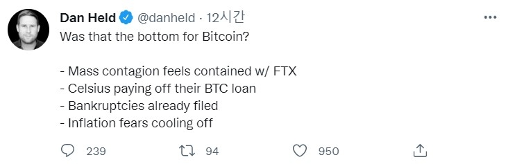 암호화폐 거래소 크라켄(Kraken)의 댄 헬드(Dan Held)는 한 암호화폐 회사의 실패가 다른 암호화폐 회사에 영향을 미치는 지속적인 도미노 효과를 보이는 '대량 전염'이 FTX 거래소에 의해 억제되었다고 주장했다.