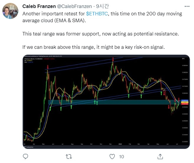 이미지 확대보기큐빅 애널리틱스(Cubic Analytics) 분석가인 칼렙 프란젠(Caleb Franzen)도 이더리움과 비트코인이 200일 이동 평균 이상으로 상승할 경우 트레이더들이 더 많은 녹색을 보게 될 수 있는 지표로 보고 있다.