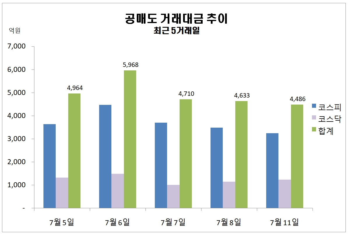 이미지 확대보기12일 한국거래소에 따르면 지난 11일 주식시장에서 공매도 거래대금 규모는 4486억원을 기록했다.