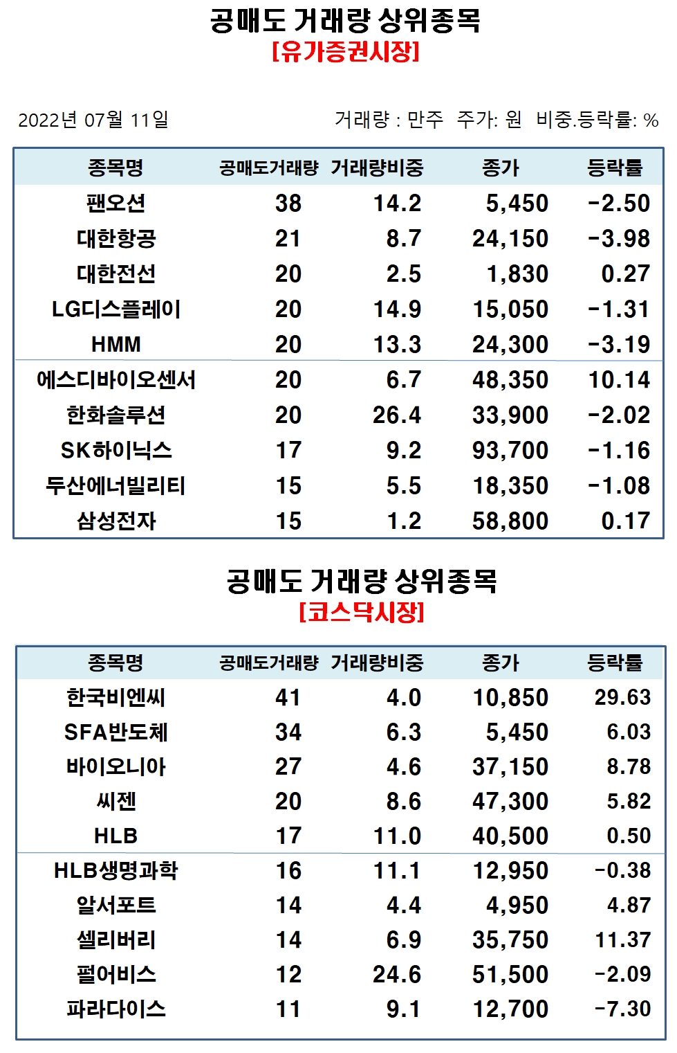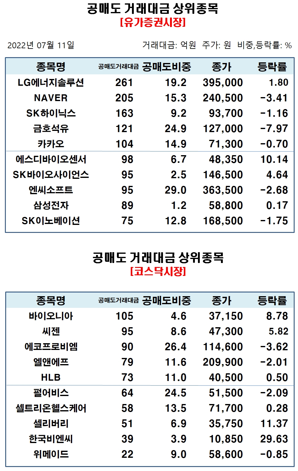 코스닥시장에서 공매도 거래비중 상위종목은 에코프로비엠 26.37%, 아이티엠반도체 25.48%, 펄어비스 24.51%, 동국제약 24.0%, 케이엠더블유 23.35%, 코웰패션 21.12%, 원익IPS 21.1%, 서울바이오시스 20.79%, 하림지주 20.46%, 이베스트투자증권 19.15% 순으로 집계됐다.
