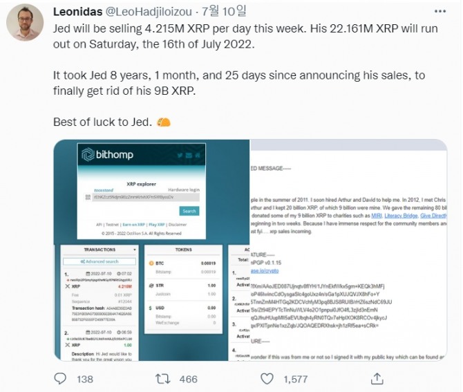 이미지 확대보기XRP아케이드 설립자 레오니다스(Leonidas)의 지난 10일 트윗에 따르면 리플 공동 창립자 제드 맥케일럽이 이번 주에 XRP 보유량을 매각할 계획이다.