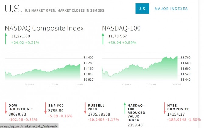이미지 확대보기15일 뉴욕증시에 따르면 나스닥 다우지수등은 미국의 도매 물가 PPI가 높은 수준을 유지한 가운데 은행들의 실적도 부진한 것으로 나타나면서 하락출발했으나 장중에 하락분을 상당 수준 만회했다.
