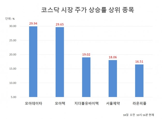 1위 모아데이타 6120원 (29.94%), 2위 모아텍 7390원 (29.65%), 3위 지더블유바이텍 1220원 (19.02%), 4위 서울제약 6340원 (18.06%), 5위 라온피플 8750원 (16.51%), 6위 HPSP 59800원 (16.12%), 7위 베셀 7740원 (12.01%), 8위 자연과환경 1510원 (12.27%), 9위 에이텍 13100원 (12.45%), 10위 보라티알 13250원 (11.34%)