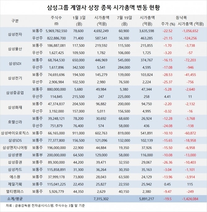 삼성그룹 상장종목은 연초인 1월 3일 시가총액이 731조5302억원에 달했으나 7월 19일 현재 589조1217억원으로 19.5%(142조4084억원) 하락해 있는 수준입니다.