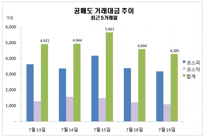 이미지 확대보기20일 한국거래소에 따르면 지난 19일 주식시장에서 공매도 거래대금 규모는 4284억원을 기록했다.
