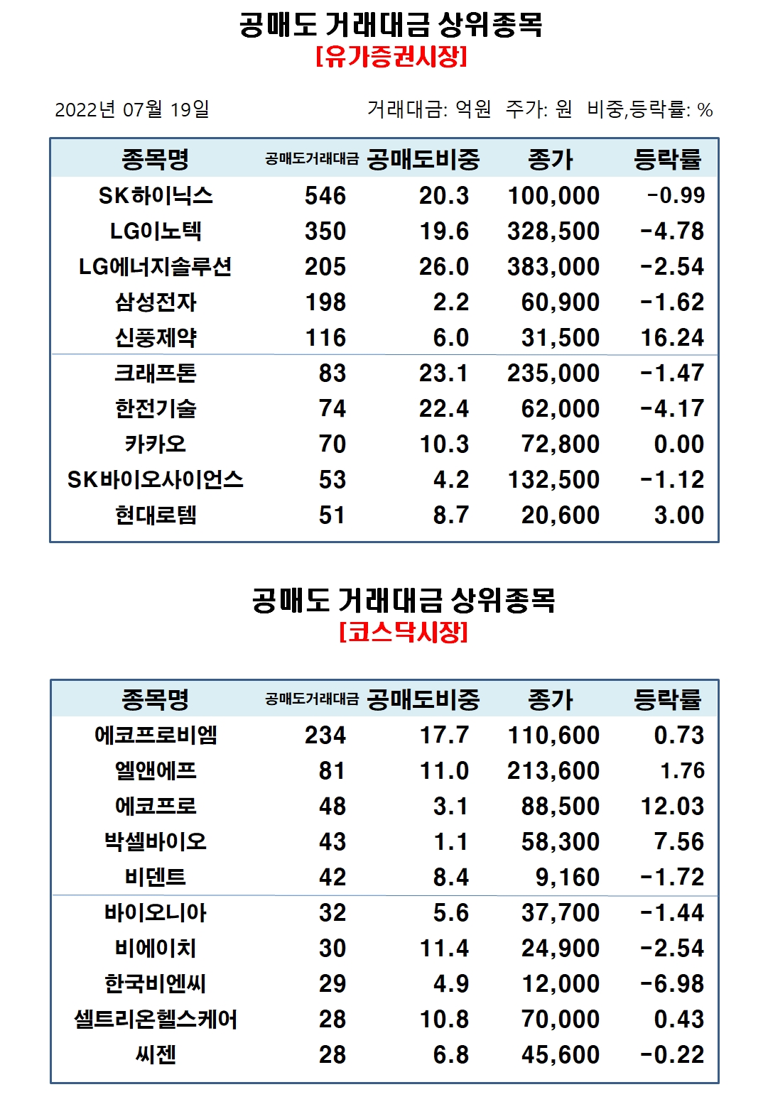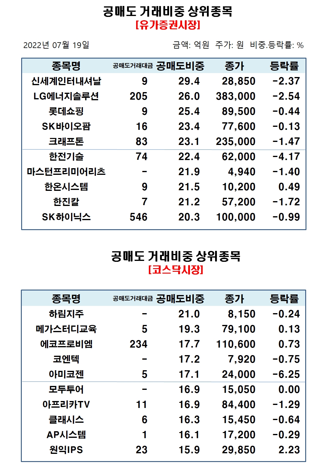 코스닥시장에서 공매도 거래비중 상위종목은 하림지주 20.96%, 메가스터디교육 19.34%, 에코프로비엠 17.65%, 코엔텍 17.17%, 아미코젠 17.12%, 모두투어 16.87%, 아프리카TV 16.85%, 클래시스 16.27%, AP시스템 16.08%, 원익IPS 15.94% 순으로 집계됐다.
