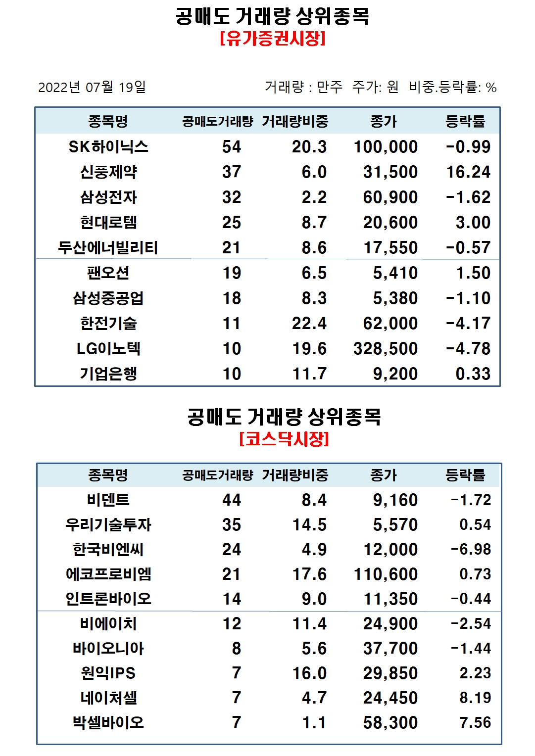 코스닥시장에서 공매도 거래량 상위종목은 비덴트 44만주, 우리기술투자 35만주, 한국비엔씨 24만주, 에코프로비엠 21만주, 인트론바이오 14만주, 비에이치 12만주, 바이오니아 8만주, 원익IPS 7만주, 네이처셀 7만주, 박셀바이오 7만주 순으로 집계됐다.