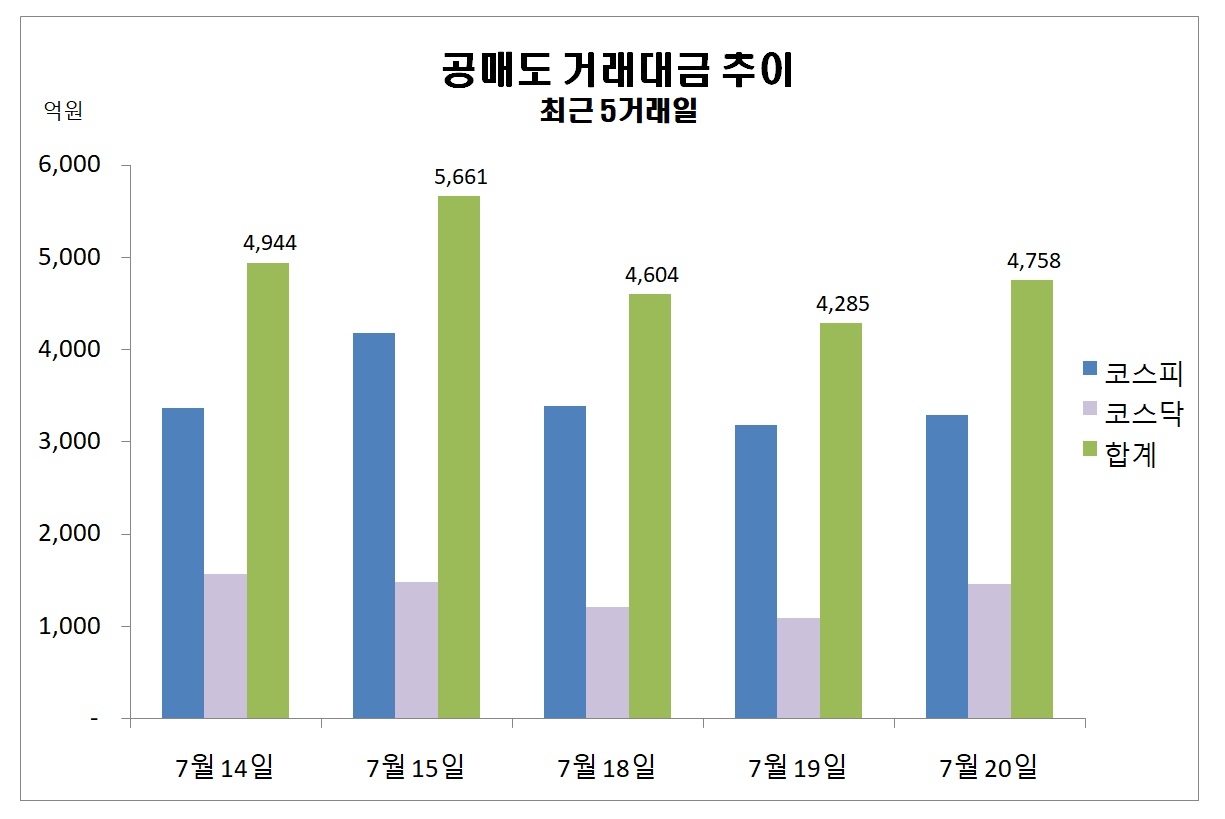 이미지 확대보기이날 공매도 거래대금은 전 거래일 보다 472억원 증가한 금액이다. 유가증권 시장에서 109억원 증가했고, 코스닥 시장에서 363억원 증가했다.
