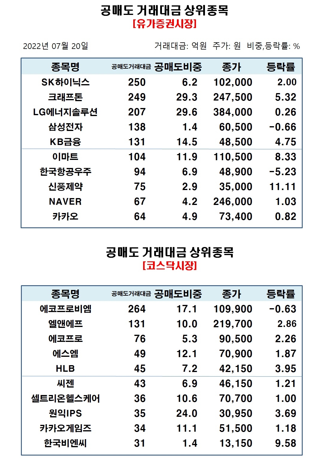 코스닥시장에서 공매도 거래대금 상위종목은 에코프로비엠 264억원, 엘앤에프 131억원, 에코프로 76억원, 에스엠 49억원, HLB 45억원, 씨젠 43억원, 셀트리온헬스케어 36억원, 원익IPS 35억원, 카카오게임즈 34억원, 한국비엔씨 31억원 순으로 집계됐다.