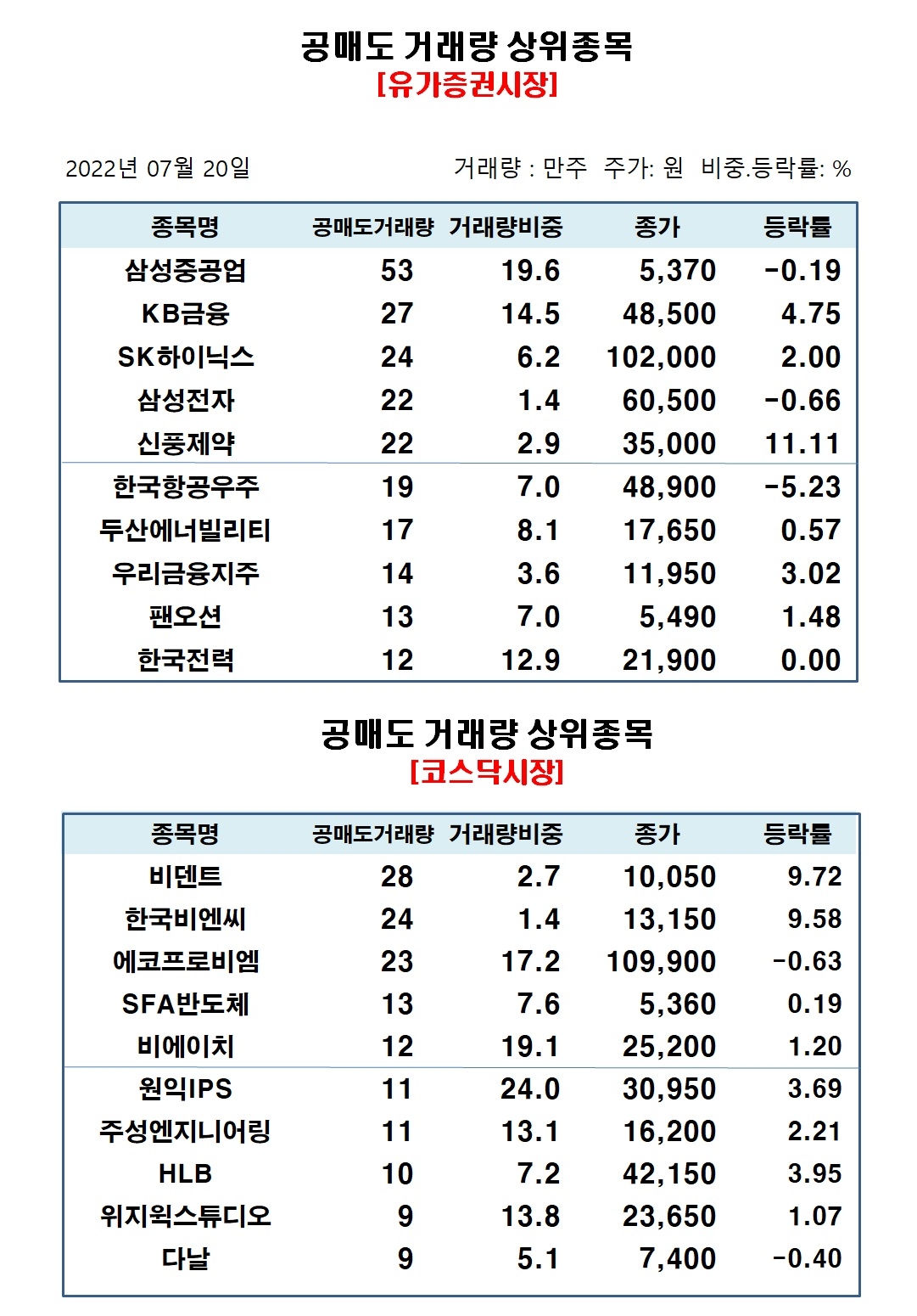 코스닥시장에서 공매도 거래량 상위종목은 비덴트 28만주, 한국비엔씨 24만주, 에코프로비엠 23만주, SFA반도체 14만주, 비에이치 12만주, 원익IPS 11만주, 주성엔지니어링 11만주, HLB 10만주, 위지윅스튜디오 9만주, 다날 9만주 순으로 집계됐다.