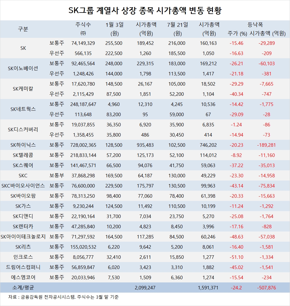 SK그룹 상장종목의 시가총액은 연초인 1월 3일 209조9247억원에서 7월 21일 159조1371억원으로 24.2%(50조7876억원) 줄었습니다.