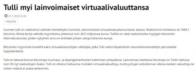 툴리는 "여름 동안 핀란드 세관은 합법적으로 국가에 몰수되었던 암호화폐를 실현했다"고 발표하면서 "1889.1 비트코인의 판매 수익으로 총 4650만 유로를 벌어들였다"고 밝혔다.