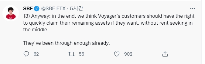 이미지 확대보기뱅크먼-프리드는 "13) 어쨌든, 결국, 우리는 보이저의 고객들이 그들이 원한다면 그들의 남은 자산을 중간에 임대료를 요구하지 않고 신속하게 청구할 수 있는 권리를 가져야 한다고 생각한다. 그들은 이미 충분히 겪었다"라고 적었다.
