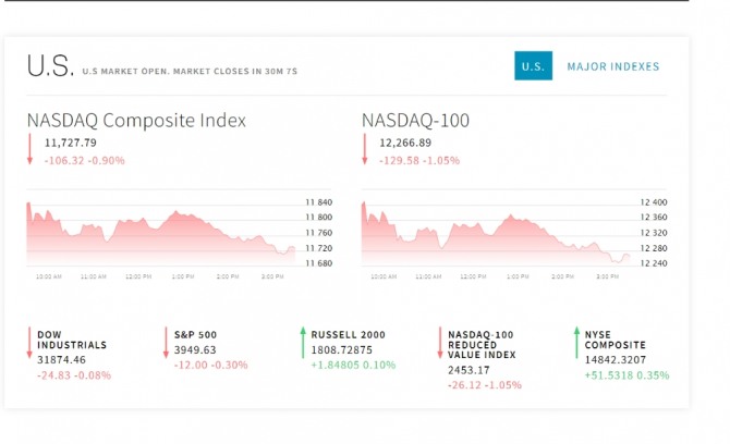 이미지 확대보기26일 뉴욕증시에 따르면 연방공개시장위원회(FOMC) 정례회의가 시작되고 대형 기술기업들이 잇달아 실적 발표를 하면서 투자자들이 방향을 찾지 못하는 모습이다. 뉴욕증권거래소(NYSE)에서 다우존스30산업평균지수와 스탠더드앤드푸어스(S&P)500지수 그리고 기술주 중심의 나스닥 지수는 혼조세를 보이다가 장 막판에 나스닥 지수가 비교적 큰 폭으로 하락하고 있다. 뉴욕증시에서는 FOMC 정례회의와 28일 나올 2분기 국내총생산(GDP) 발표 그리고 마이크로소프트, 알파벳, 애플, 아마존 등의 기술 기업 실적을 주시하고 있다.