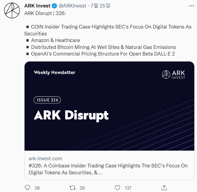 이번 매각에 앞서 아크 인베스트는 지난 25일 뉴스레터를 통해 '#326: 코인베이스 내부자 거래 사례는 증권 등의 디지털 토큰에 대한 SEC의 초점을 강조합니다'라는 제목의 글을 게재했다.