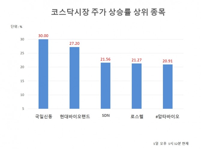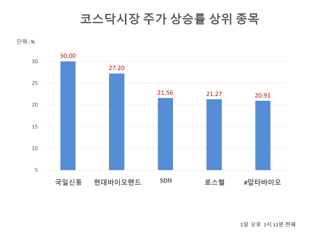 한편, 1일 오후 1시 12분 현재 코스닥 상승률 상위 30개 종목은 다음과 같다.