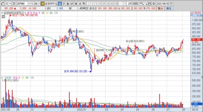 이미지 확대보기삼성바이오의 주가는 2일 오전 9시 5분 현재 전일보다 3000원(0.34%) 오른 88만1000원에 매매되고 있습니다. 삼성바이오의 주가는 닷새째 오름세를 보이고 있습니다.