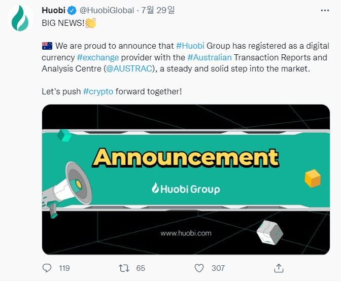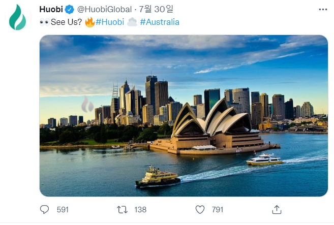 이미지 확대보기후오비는 지난달 29일과 30일 트윗을 통해 후오비 그룹이 호주에서 디지털 통화 #거래소 공급자로 등록되었음을 알렸다. 호주 시장으로의 착실하고 견고한 발걸음을 떼겠다고 밝혔다.