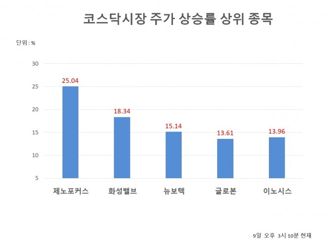 9일 오후 3시 10분 현재 코스닥 상승률 상위 30개 종목은 다음과 같다.