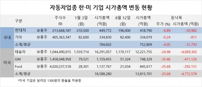 반면 미국 테슬라, GM, Ford의 시가총액 합계는 1월 3일 1858조8280억원에서 8월 12일 1381조5701억원으로 25.68%(477조2578억원) 하락했습니다.