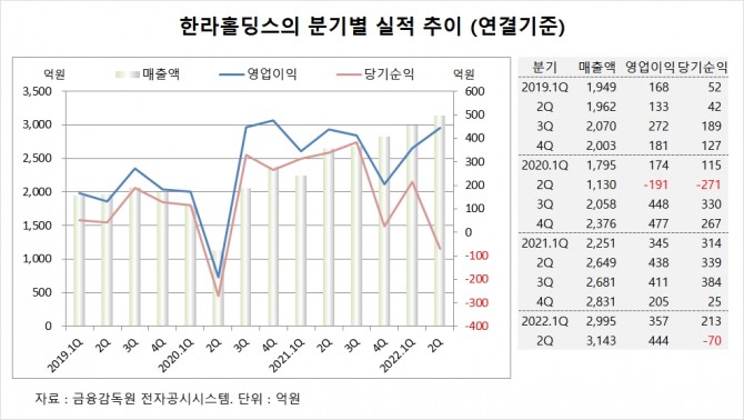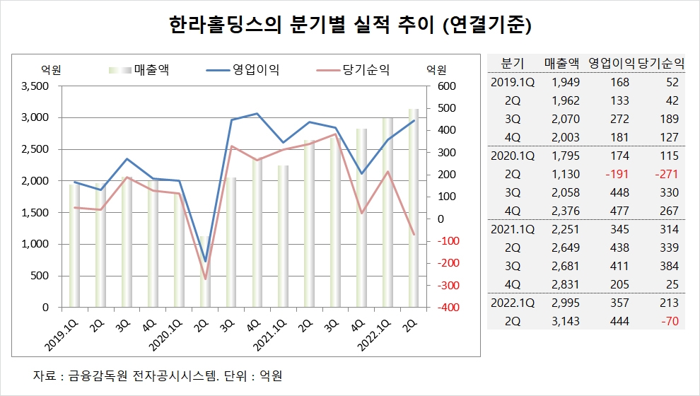 이미지 확대보기한라홀딩스는 올해 2분기 실적을 집계한 결과 연결기준 매출액이 3143억원, 영업이익이 444억원, 당기순이익이 –70억원을 기록했다고 공시했습니다.