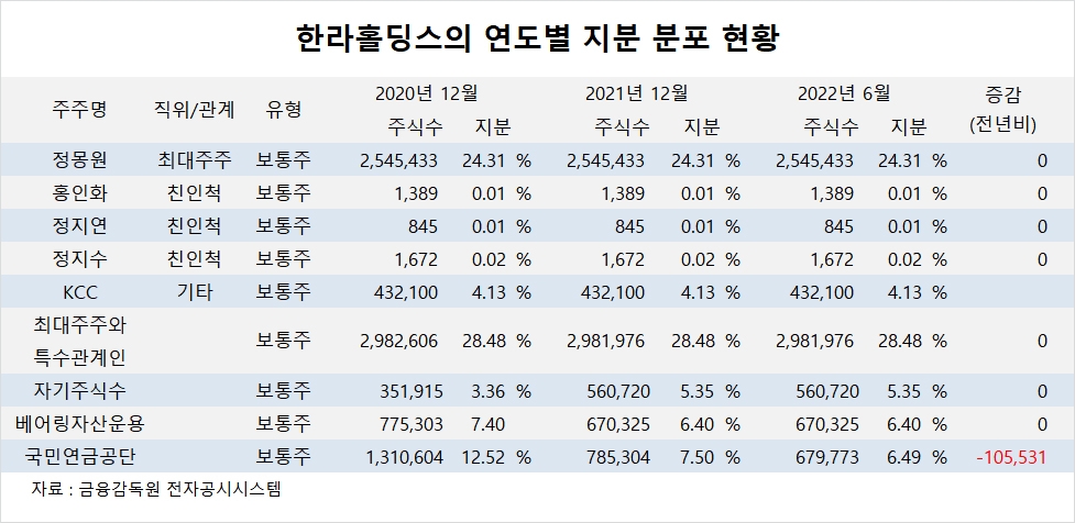 이미지 확대보기한라홀딩스의 최대주주는 정몽원 회장으로 지분 24.31%를 보유하고 있습니다.