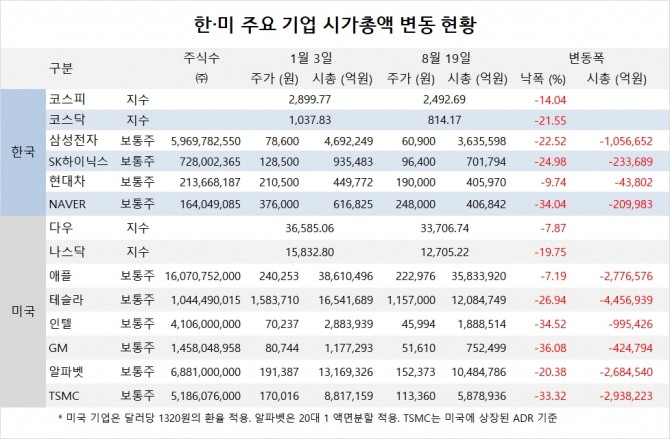 미국 주요 주식 가운데 가장 큰 시가총액을 차지하는 애플은 19일 종가 24만253원으로 시가총액이 3583조3920억원 규모이며 연초보다 7.19% 하락했습니다. 애플은 IT 종목이지만 낙폭이 훨씬 덜했고 삼성전자 낙폭의 절반 수준에서 머문 것으로 나타났습니다. 미국 주요 주식에는 원/달러 환율 1320원이 적용됐습니다.