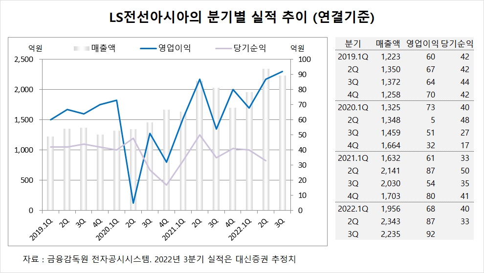 이미지 확대보기대신증권은 LS전선아시아의 올해 3분기 실적이 연결기준 매출액 2235억원, 영업이익이 92억원에 이를 것으로 내다보고 있습니다.