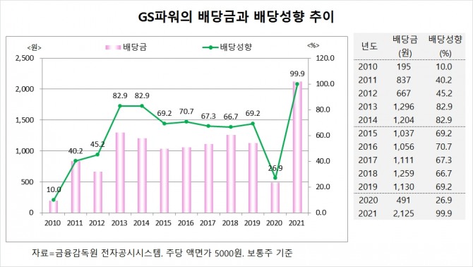 GS파워는 2021년에도 1주당 2125원의 배당금을 지급했고 현금배당성향이 99.9%에 달합니다. 사실상 2021년도에 벌어들인 순익을 그대로 모회사인 GS에너지와 크레토스에 넘겨준 셈입니다.