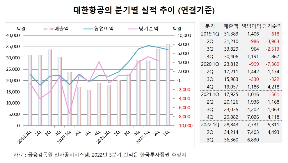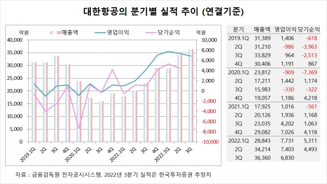 한국투자증권은 대한항공의 올해 3분기 연결기준 매출액이 3조6360억원, 영업이익이 6830억원에 이를 것으로 전망하고 있습니다.