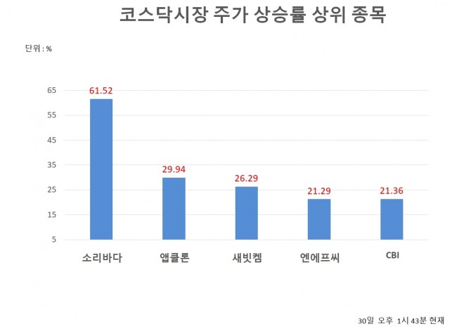 30일 오후 1시 43분 현재 코스닥 상승률 상위 40개 종목은 다음과 같다.