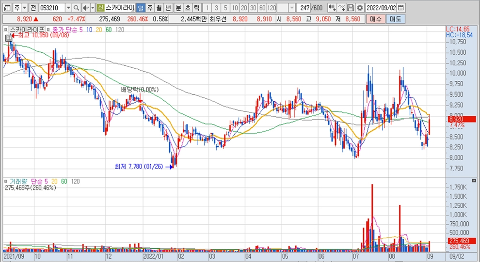 이미지 확대보기스카이라이프의 주가는 2일 오전 10시 10분 현재 전일보다 620원(7.47%) 오른 8920원에 매매되고 있습니다.