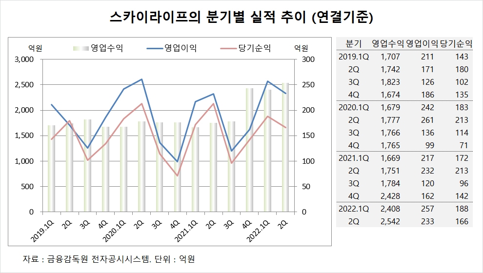 스카이라이프는 올해 2분기 연결기준 영업수익(매출액)이 2542억원, 영업이익이 233억원, 당기순이익이 166억원을 기록했다고 공시했습니다.