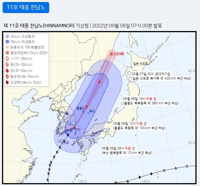 이미지 확대보기기상청은 태풍 힌남노가 6일 오전 4시 50분께 경남 거제시 부근으로 국내에 상륙해 오전 7시 10분께 울산 앞바다로 빠져나갔다고 밝혔다.