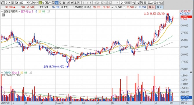 이미지 확대보기현대일렉트릭의 주가는 7일 오전 10시 10분 현재 전일보다 500원(1.54%) 오른 3만3000원에 거래되고 있습니다.