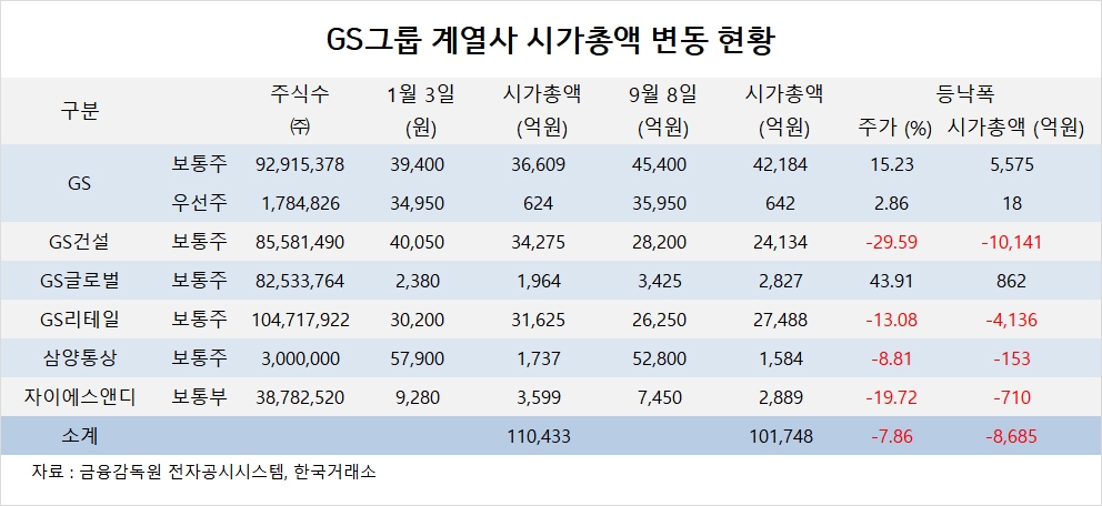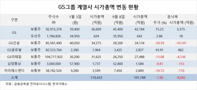 이미지 확대보기GS그룹 계열사의 시총은 9월 8일 기준으로 10조1748억원 규모로 연초인 1월 3일의 11조433억원에 비해 7.86%(8685억원) 감소했습니다.