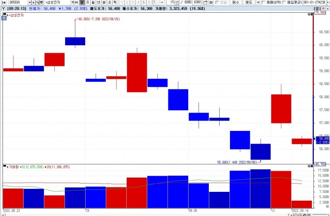 이미지 확대보기14일 한국거래소에 따르면, 이날 주식시장에서 오전 9시10분 현재 삼성전자 주가는 전거래일 보다 2.93% 하락한 5만6400원에 거래되고 있다. 장중 최저가는 3.44% 하락한 5만6100원이다.