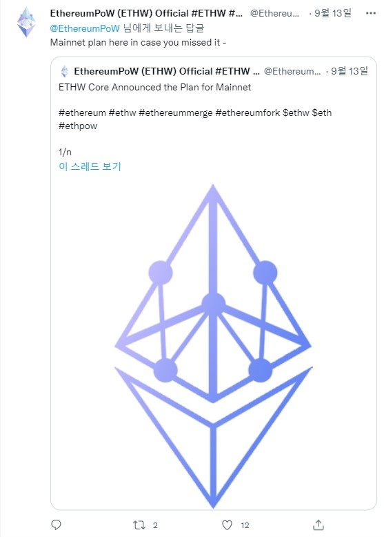 이 그룹은 13일 트윗을 통해 "ETHW 메인넷은 합병 후 24시간 이내에 발생할 것이다. 정확한 시간은 카운트다운 타이머와 함께 발사 1시간 전에 발표될 것이며 최종 코드, 바이너리, 구성 파일, 노드 정보, RPC, 탐색기 등을 포함한 모든 것은 시간이 다 되면 공개될 것"이라고 밝혔다.