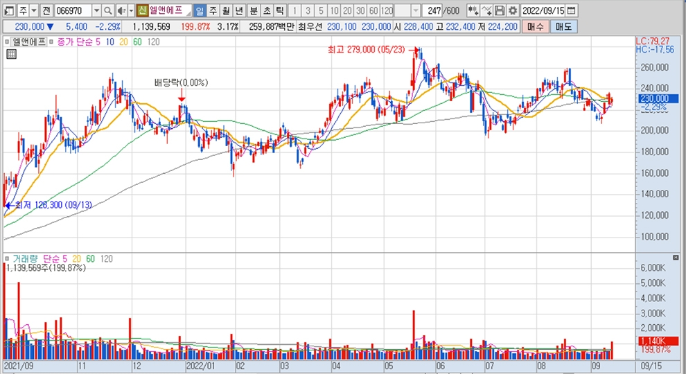 이미지 확대보기엘앤에프의 주가는 지난 15일 전일보다 5400원(2.29%) 내린 23만원에 거래를 마감했습니다.