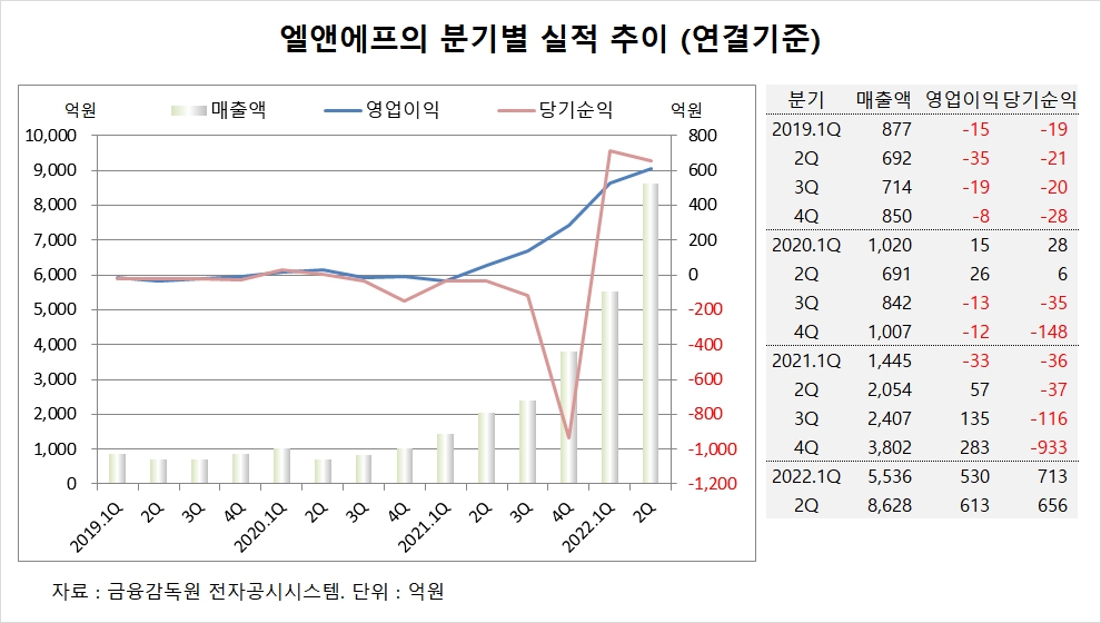 엘앤에프는 올해 2분기 실적을 집계한 결과 연결기준 매출액이 8628억원, 영업이익이 613억원, 당기순이익이 656억원을 기록했다고 공시했습니다.