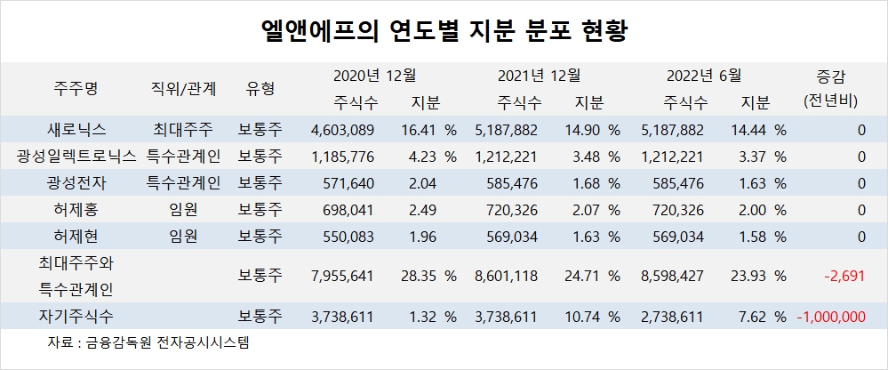 이미지 확대보기엘앤에프의 최대주주는 새로닉스로 지분 14.44%를 보유하고 있습니다.