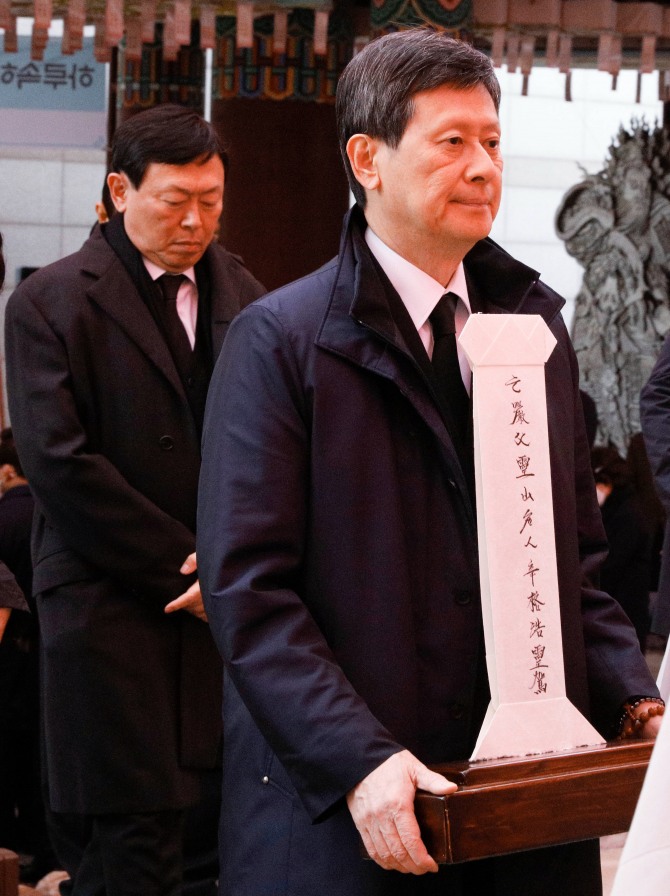 이미지 확대보기신동주(오른쪽) SDJ코퍼레이션 회장, 신동빈 롯데그룹 회장이 지난 2020년 3월 7일 오전 서울 조계사에서 엄수된 고 신격호 롯데그룹 명예회장의 49재에서 대웅전으로 이동하고 있다. 자료사진=뉴시스 롯데지주는 최대주주등소유주식변동신고서 공시를 통해 신동주 SDJ 코퍼레이션 회장이 롯데지주 우선주 보유 지분을 모두 매각했다고 26일 공시했다.