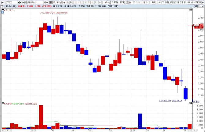 이미지 확대보기27일 한국거래소에 따르면 지니틱스 주가는 오전 9시8분 현재 전거래일 보다 29.95% 상승한 2690원에 거래되고 있다. 지니틱스의 시가총액은 961억원이다.